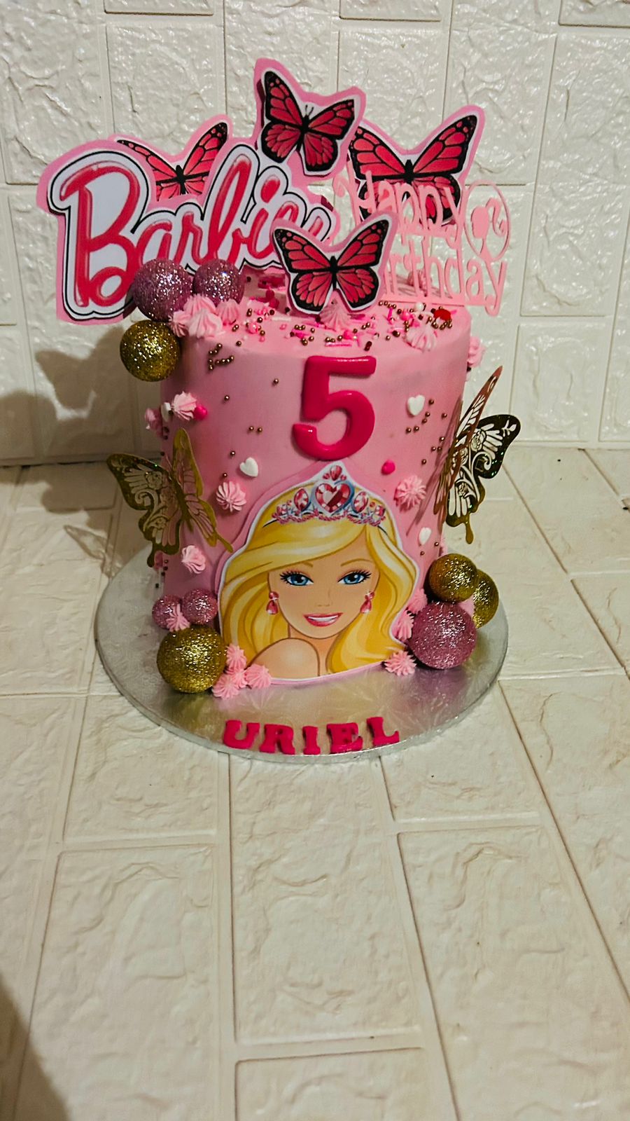 - Theme: Barbie. It features the “Barbie” logo, a picture of Barbie at the base, and a name topper that says “Nkhanyiso”.